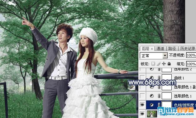 | 1、打开素材图片,创建色相/饱和度调整图层,对全图、黄色,绿色进行调整,参数设置如图1 - 3,效果如图4。这一步快速把图片中的黄绿色转为青绿色。 |