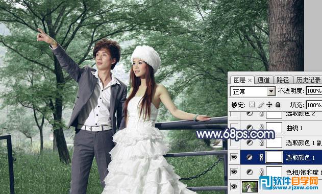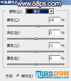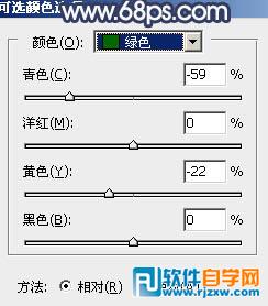 | 2、创建可选颜色调整图层,对绿色、青色,黑色进行调整,参数设置如图5 - 7,效果如图8。这一步把图片中的绿色稍微调暗一点。 |