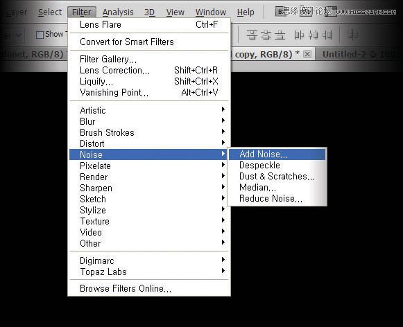 3、选择菜单栏上的 > 杂色 > 添加杂色。