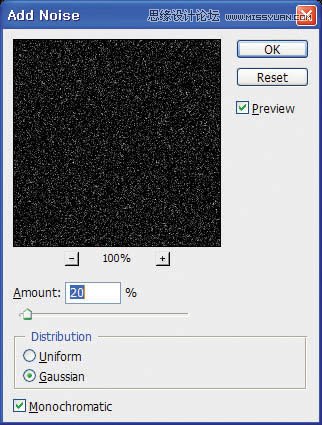 4、选择单色高斯分布,数量调整至20%,然后确定。