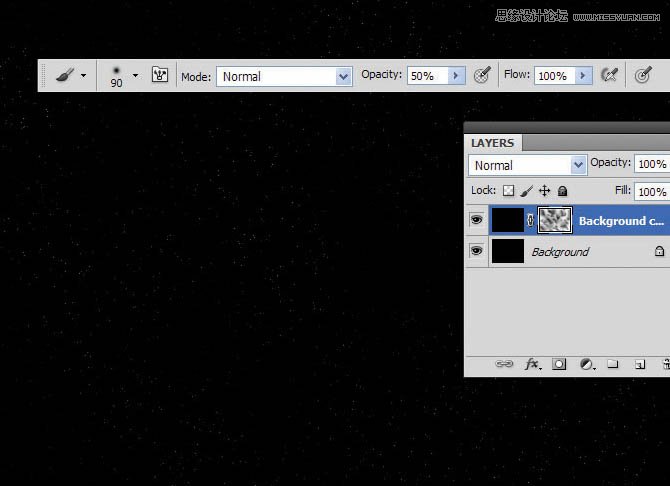 7、前景色为黑色,再用画笔工具,设置不透明度50%,选择蒙版区域,将图层涂抹致模糊甚至消失,将星星远到近的角度表现出来。为了表现的自然,适当的调整画笔的大小。