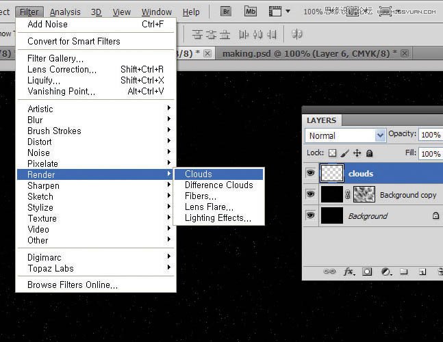 8、设置前景色 #1e5285,背景色 #000000,然后新建图层命名为clouds,选择 滤镜 > 渲染 > 分层云彩,蓝色的云就形成了。