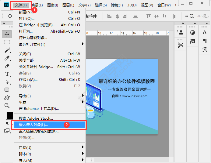 3、再一次,点击【文件】菜单,点击【置入嵌入对象】。