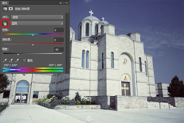 Step 1:添加一个“色相/饱和度”调整图层。单击带有左右箭头的小手,然后在图像中的蓝色天空区域单击。将明度调整到-50,使天空变暗。