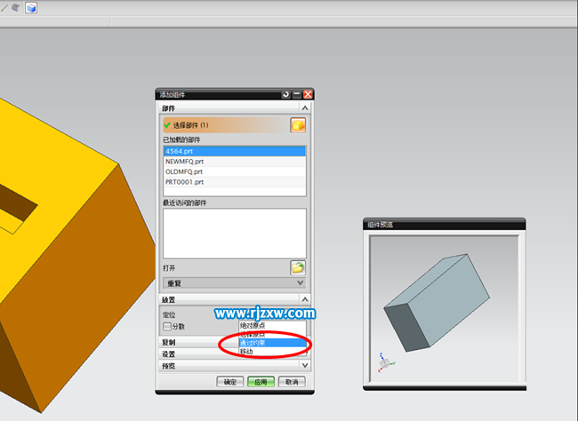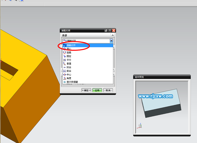 第4步、按照面与面的装配,可以选择自己想要的类型,这里可以选择接触对齐,就是装配面与面之间是接触的。
