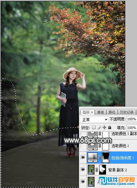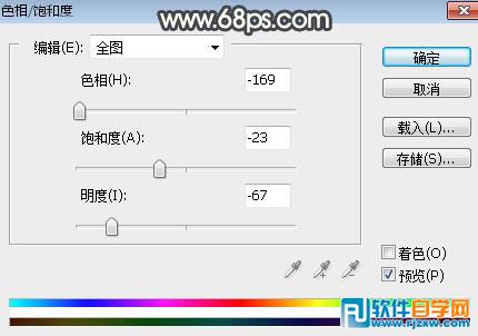 | 2、创建色相/饱和度调整图层,对全图进行调整,参数设置如图2,确定后把蒙版填充黑色,然后用柔边白色画笔把底部及路面部分涂暗,效果如图3。 |