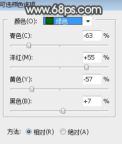 | 3、创建可选颜色调整图层,对绿色进行调整,参数及效果如下图。这一步把图片中的绿色转为黄褐色。 |
