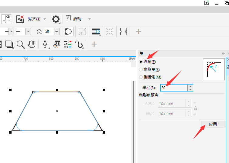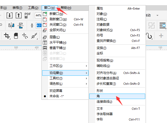 2、选中梯形,点击窗口菜单,点击泊坞窗,点击角。如下图: