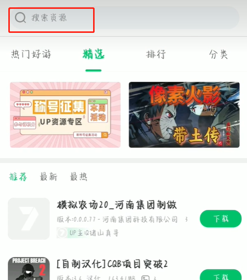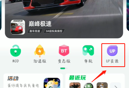 许多玩家想要玩一些其他玩家制作的游戏就可以进入up资源这里进行查找和下载体验,具体的位置就在首页的UP资源,非常的明显也很好找到。