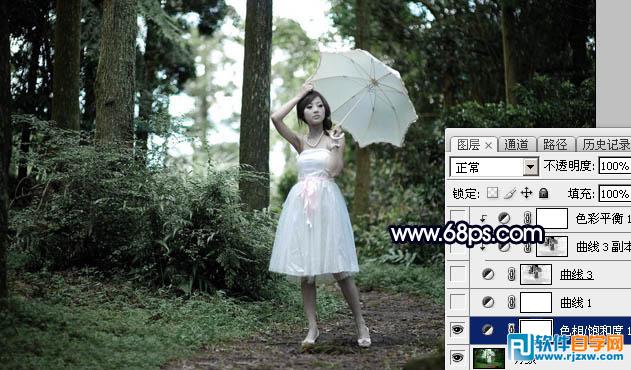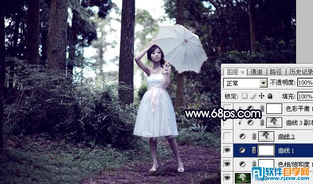 | 2、创建曲线调整图层,对RGB、绿、蓝通道进行调整,参数设置如图6 - 8,效果如图9。这一步增加图片明暗对比,并给暗部增加蓝紫色。 |