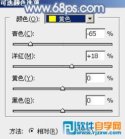 | 1、打开素材图片,创建可选颜色调整图层,对黄色进行调整,参数及效果如下图。这一步给图片增加橙黄色。 |