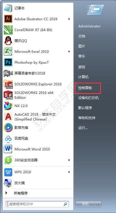 4、进入系统后,点击左下角的开始菜单,点击控制面板。