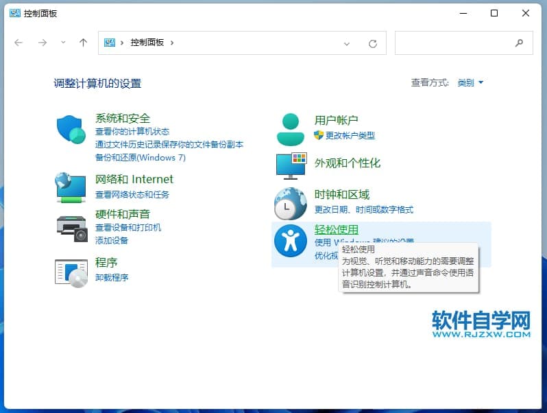 2、控制面板窗口,按照类别查看方式,找到并点击轻松使用(为视觉、听觉和移动能力的需要调整计算机设置,并通过声音命令使用语音识别控制计算机);