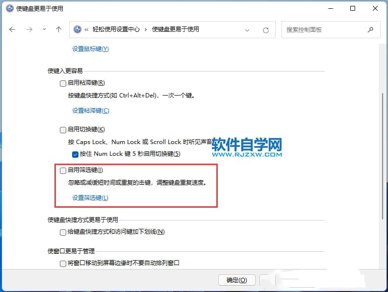 4、使键盘更易于使用窗口,取消勾选启用筛选键(忽略或减缓短时间或重复的击键,调整键盘重复速度),然后点击应用确定即可。