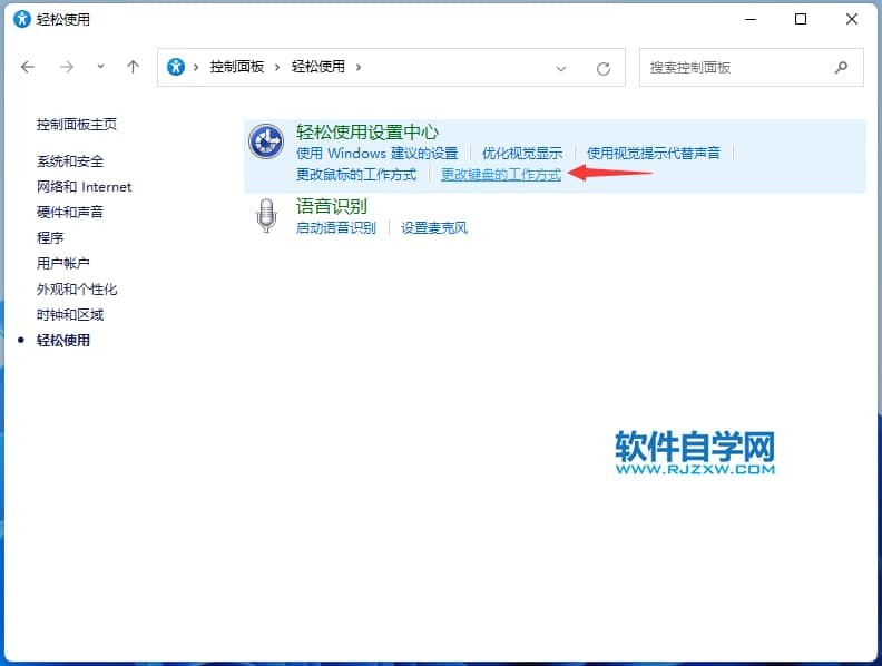 3、轻松使用窗口,点击轻松使用设置中心下的更改键盘的工作方式;