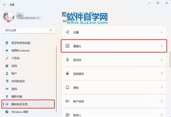 2、打开Windows 11系统的【设置】,可使用快捷键【win+I】打开,然后切换到【隐私和安全性】,点击【摄像头】;