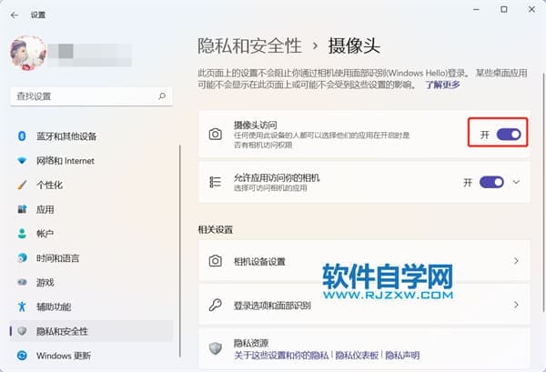 3、在摄像头设置页面,开启【摄像头访问】权限,便于后面获取权限;