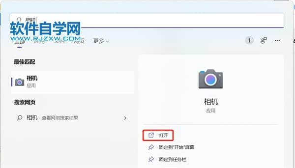 4、通过Windows 11系统的【开始】或者【搜索】功能,搜索查找【相机】点击打开相机;