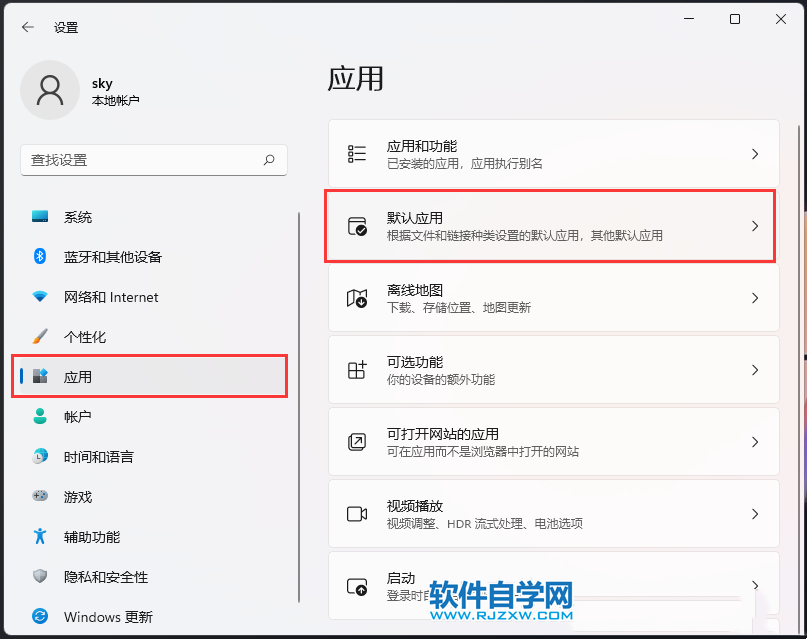 2、设置窗口,左侧边栏,点击【应用】,右侧点击【默认应用(根据文件和链接种类设置的默认应用,其他默认应用)】;