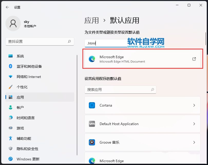3、当前路径为:应用>默认应用,为文件类型或链接类型设置默认值下,搜索框输入【html】,然后在打开的下拉选项中,找到并点击【.html】;