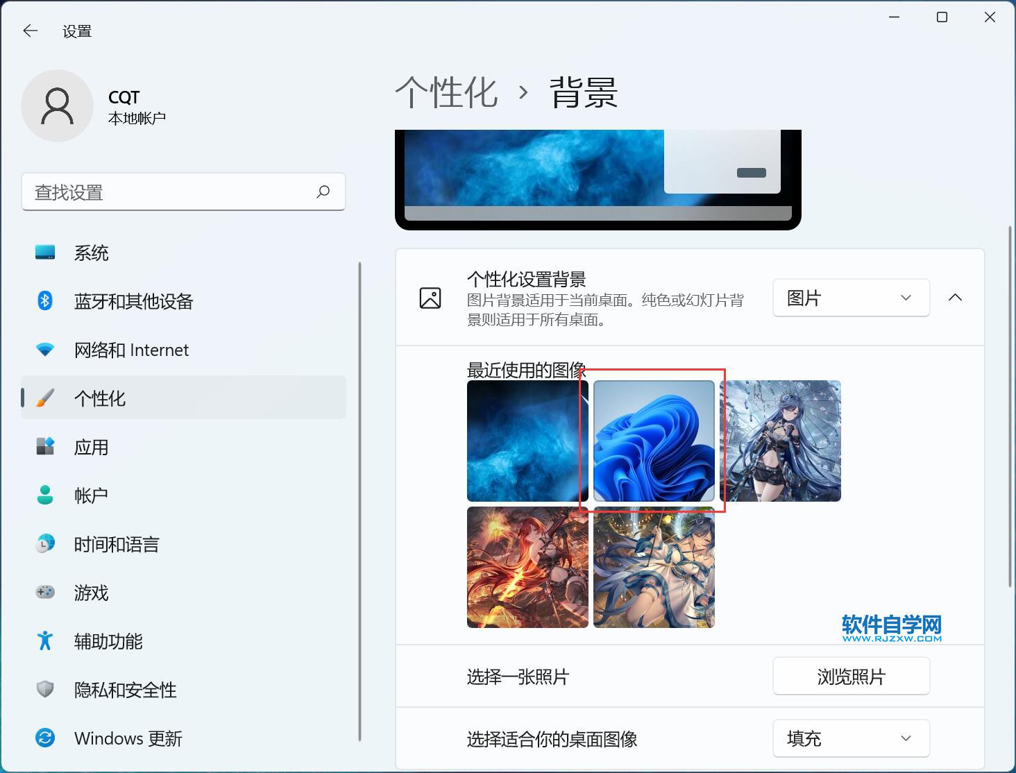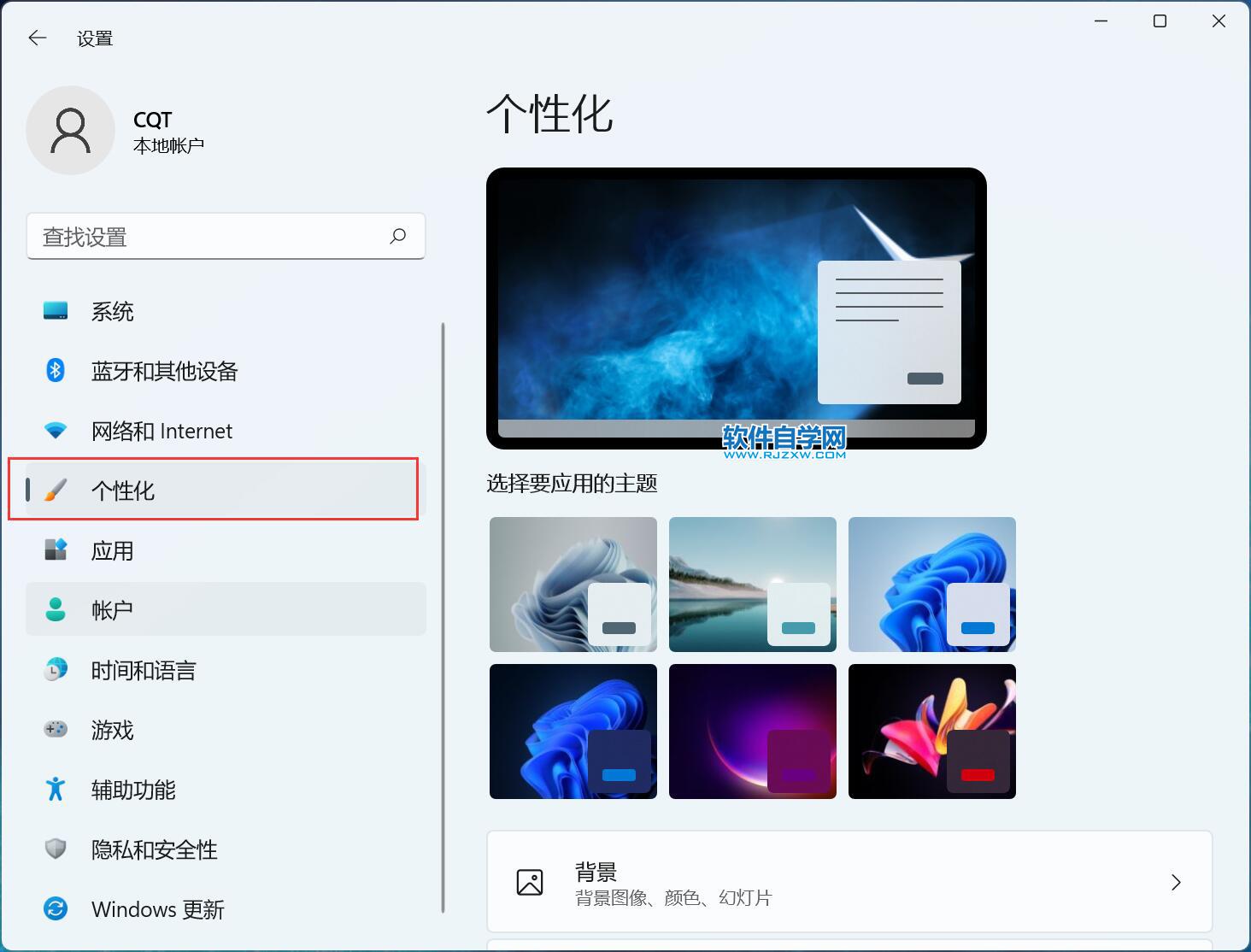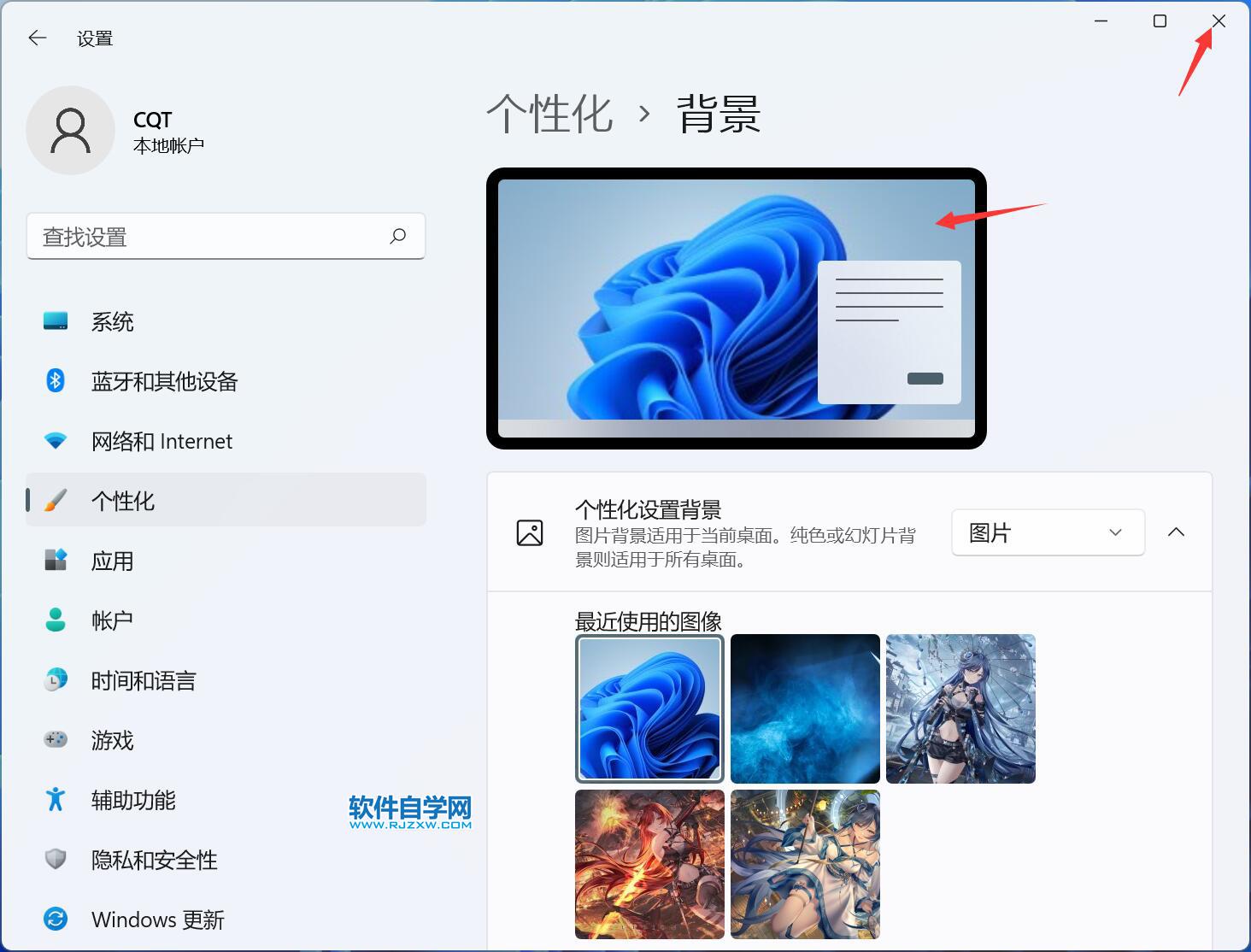 win11怎么更改桌面上的背景图 日期:2025-12-15 13:50:19 栏目:系统教程 浏览:6 评论:0 1、点击电脑桌面上的开始菜单。如下图: 2、点击设置图标。如下图: 3、点击个性化图标。如下图: 4、点击背景,如下图: 5、选择背景图标。 6、预览上面改了后,点击关闭。 上一篇:win11怎么关闭允许应用使用我的广告ID向我展示个性化广告 下一篇:高校辅导员工作总结怎么写 相关推荐 在CAD中标注就是_颜色得 联想电脑安装win10无法识别硬盘怎么办 电脑任务栏空白卡死怎么解决 试用期个人工作总结5篇最新 评论留言 我要留言 ◎欢迎参与讨论,请在这里发表您的看法、交流您的观点。 昵称:* 邮箱:* 网址: 内容: 取消回复