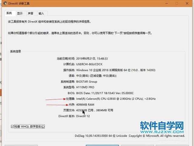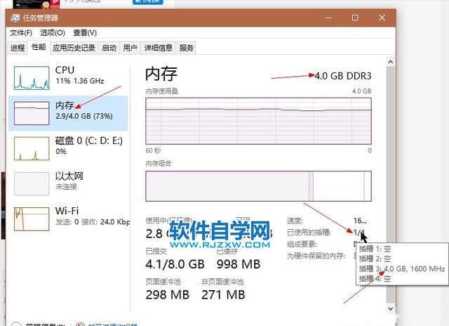 7、右上角显示内存大小,右下角分数表示内存条插孔和已使用插孔,如果是两个插孔使用就是双通道;