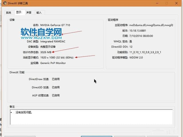 4、然后点击下一步,检查图中标记的几处,分别是显卡型号、显卡显存、显示器分辨率和刷新率等;