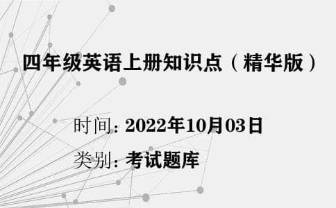 如今,英语已经成为了世界语,渗透在全世界的每一个角落,政治、经济、文化、娱乐,可以说,我们每天的生活,以及生活的每个方面,都在这种语言的影响之下。下面小编为大家带来四年级英语上册知识点希望大家喜欢!