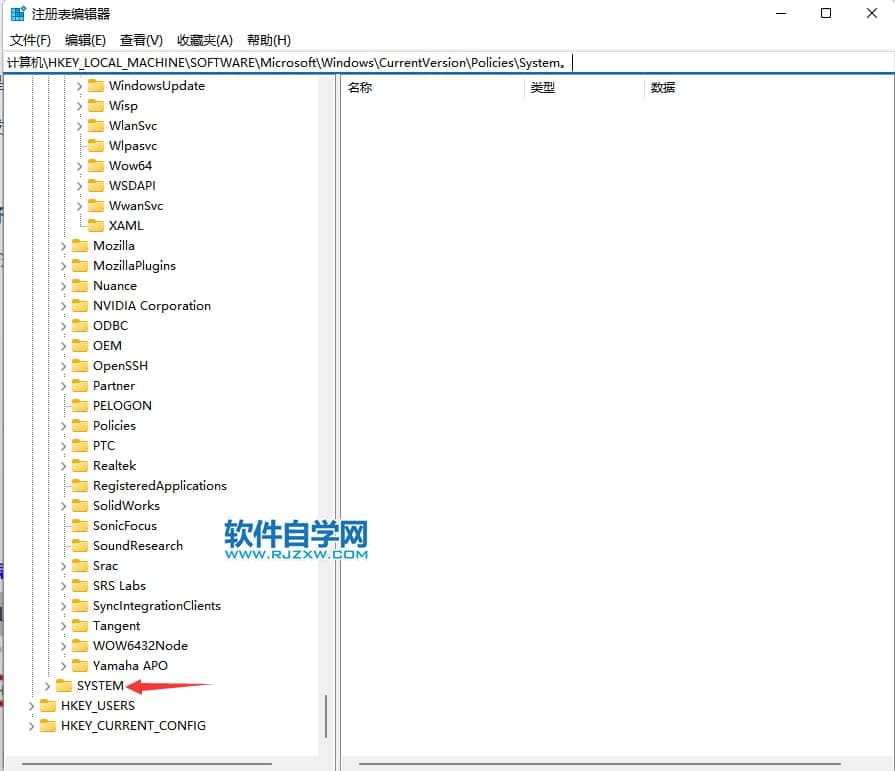 第2步、打开注册表之后依次展开:HKEY_LOCAL_MACHINESOFTWAREMicrosoftWindowsCurrentVersionPoliciesSystem。