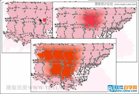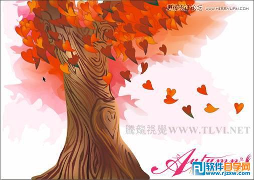 在上一节实例中,我们使用“交互式调和”工具制作了过渡柔和的花瓣,本节实例将使用网格填充工具制作柔和的颜色过渡效果。相比较来看,网格填充工具可以设置更多的颜色,产生更多的颜色变化效果。另外,网格填充可以根据形体的转折设置颜色渐变,这使得对图形的填充变得更为灵活。实例中树干、树冠、树叶图形的色彩填充,都是使用“交互式网格填充”工具创建的,填充时将多组颜色自然融合在一起,制作出绚丽的画面效果。如图2-31所示,为本实例的制作流程。
