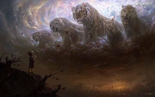 这天下午,库塔带着小猫到郊区的小山坡玩,黄昏落日下,他站在高坡处仰望天空,看着天空的团团火烧云,库塔以异于大人的想象力,仿佛看到了天际上,百兽之王老虎的亡魂,威风凛凛地率领着大猫们,回来到了地球……