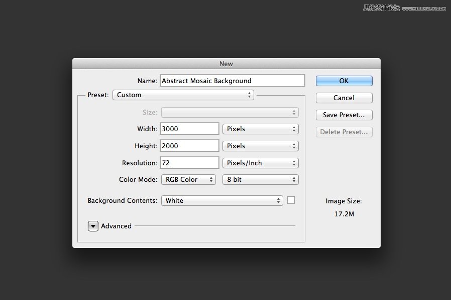 新建文件,大小根据你的背景需求就好,3000 * 2000px 大小足以覆盖任何屏幕了。