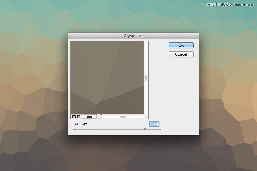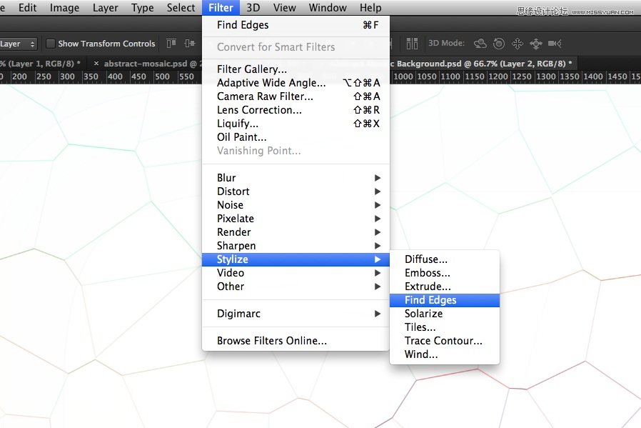 还是第二个图层,单击 > 像素化 > 晶格化,大小还是250 px,接着单击滤镜 > 风格化 > 查找边缘。