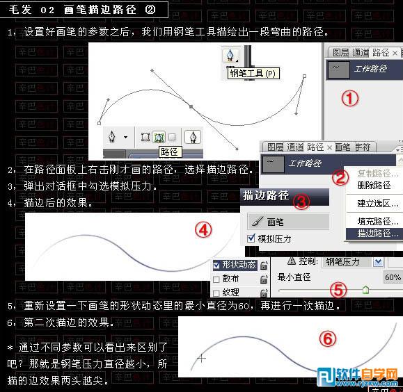 | 二、单根发丝的制作方法。 1、设置好画笔的参数后,我们用钢笔工具描绘出一段弯曲的路径; 2、在路径面板上右击钢笔画的路径,选择描边路径; 3、在弹出的对话框勾选模拟压力; 4、描边后的效果如下图4所示; 5、重新设置一些画笔的形状动态里的最小值为60,再进行一次描边; 6、第二次描边后的效果发丝清晰一点; |