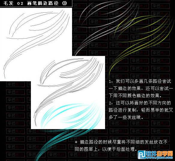 | 三、多根发丝的制作方法。 1、我们可以多画几条路径尝试一下描边的效果,还可以尝试一下用不同的颜色描边的效果; 2、还可以将画好的不同的方向的路径进行复制,轻而易举的就又多了一些发丝; |
