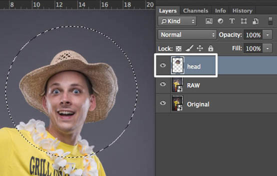 四、按下shift+alt键,从人的右眼靠鼻子一端的眼角开始选择一个大大圆形(包住人头和脖子,如下),按下ctrl+J键复制一图层,并命名为”head”。