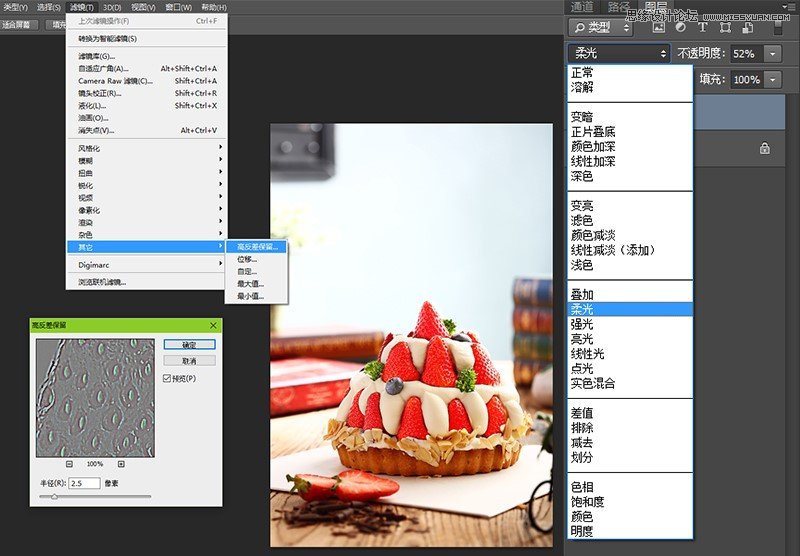 第二步:新建图层,将图层模式改为“柔光”,调整图层透明度,这个数值大家根据具体的菜品和光线而定。