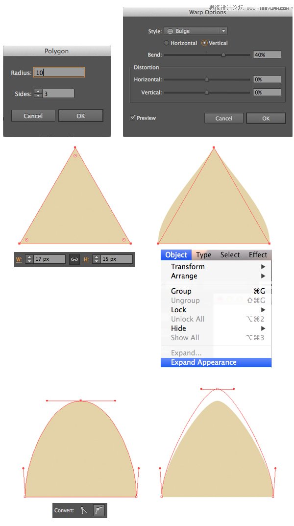 选取多边形工具并制作一个大小大约为17 * 15 px的三角形。 使用效果>变形>凸出并设置垂直方向的弯曲值为40%。