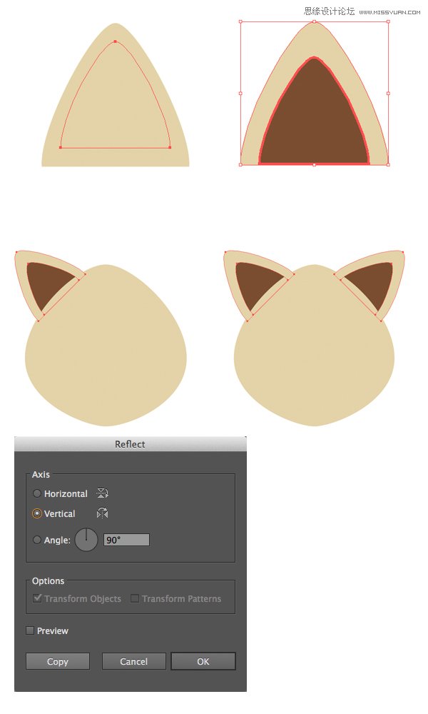 旋转耳朵并将其放置在头部的左边,将其置于底部(Control-Shift-[),在头部形状的下面。 通过双击工具面板上的镜像工具(O)水平轴翻转耳朵制作一份复本,并将其放置在头部相对的一边。