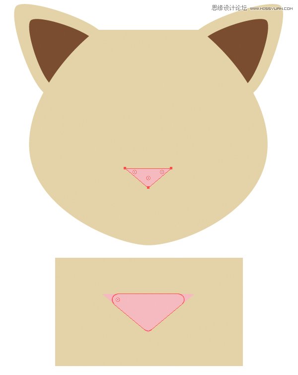 用多边形工具制作一个粉色的3角形鼻子。 选中鼻子,拖拽实时转角的控制点,使形状变圆。 如果这个功能在你的 Adobe Illustrator的版本中不可用,使用效果>风格化>圆角可以做到相同的效果。
