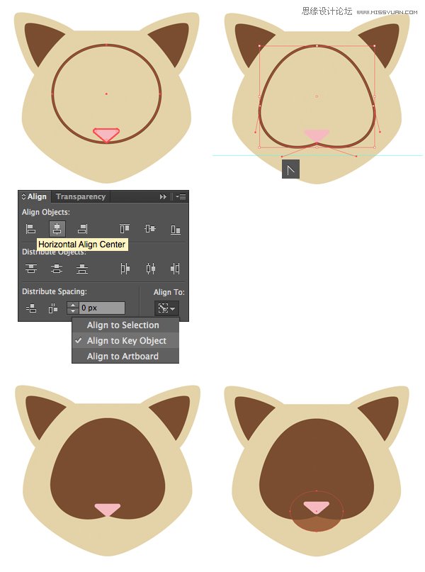 利用鼻子作为一个关键对象,将椭圆对齐到鼻子上。 要做到这一点,需要选择2个形状并按住Alt键时点击鼻子形状。 你将会在鼻子周围看到一个厚厚的描边,指示关键对象。 前往对齐面板并点击水平居中对齐。