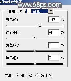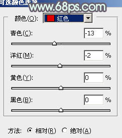 七、创建可选颜色调整图层,对红、绿、青,白进行调整,参数设置如图12 - 15,效果如图16。这一步主要给图片增加暖色。