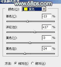 一、打开素材图片,创建可选颜色调整图层,对黄色进行调整,参数及效果如下图。这一步把图片中的黄色转为橙黄色。