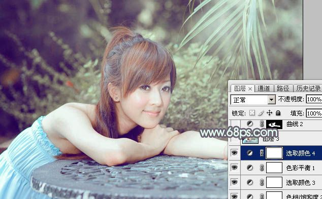 素材背景基本为绿色,的时候可以先加强一下主色层次感,然后降低饱和度等得到较为中性的颜色,再把整体调淡一点即可。 最终效果