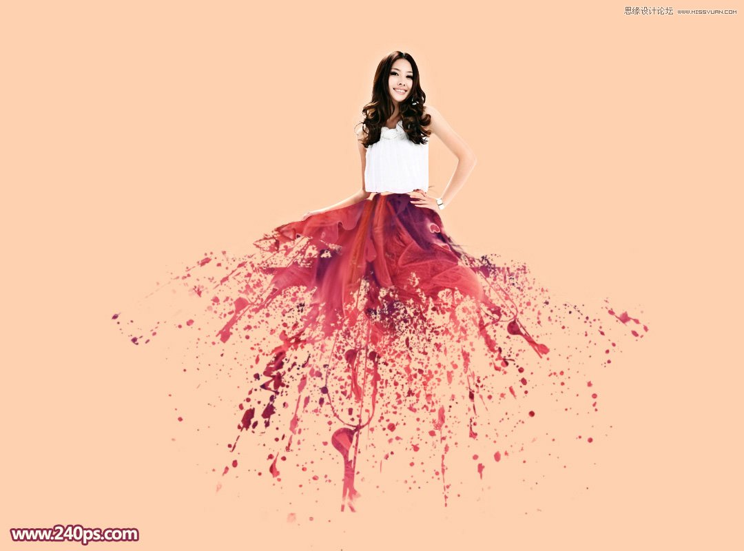 效果图制作分为两部分:布艺裙子和喷溅效果。我们先要用一些有层次的布艺有层次感的裙子;然后再用蒙版配合喷溅给裙子增加喷溅效果,