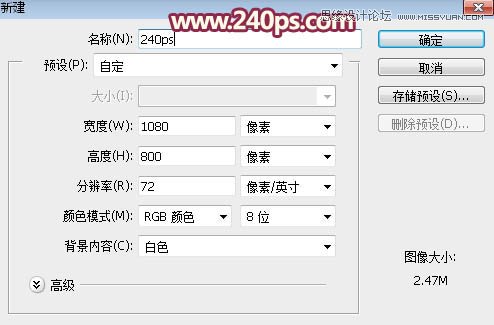 1、打开PS软件,按Ctrl + N 新建画布,尺寸为1080 * 800像素,分辨率为72像素/英寸,如下图。