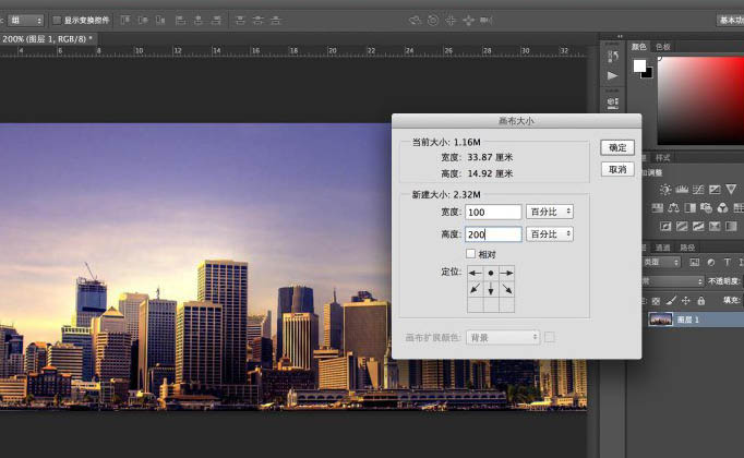 2、修改画布大小,将单位改为“百分比”,高度改为“200”;由于制作的倒影是向下延展,所以定位方向向下,鼠标点击定位中的小圆点位置。