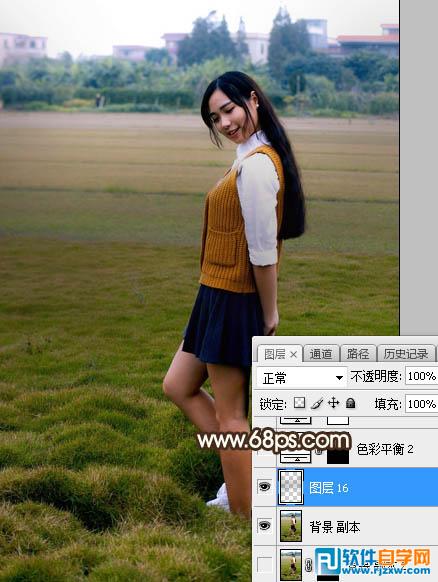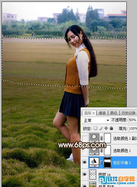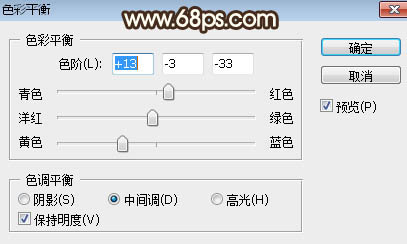 | 3、创建色彩平衡调整图层,对阴影,中间调进行调整,参数设置如图3,4,确定后把蒙版填充黑色,然后用柔边白色画笔把图5所示的区域涂出来,确定后把图层不透明度改为:50%。 |