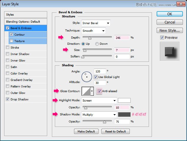 深度:246大小:7 勾选消除锯齿 高亮模式 -滤色 不透明度:10% 影子模式 -正片叠底 颜色:#4f4f4f