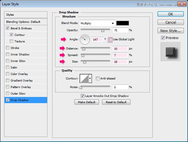 取消勾选使用全局光 角度:147 距离:10 扩展:7 大小:18